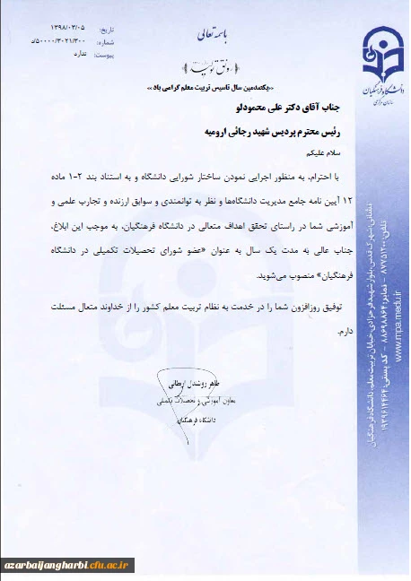 با ابلاغ از سوی دکتر روشندل معاون آموزشی و تحصیلات تکمیلی سازمان مرکزی دانشگاه فرهنگیان انتصاب جناب آقای دکتر محمودلو سرپرست امور پردیس های استان آذربایجان غربی به عنوان عضو شورای تحصیلات تکمیلی دانشگاه فرهنگیان کشور