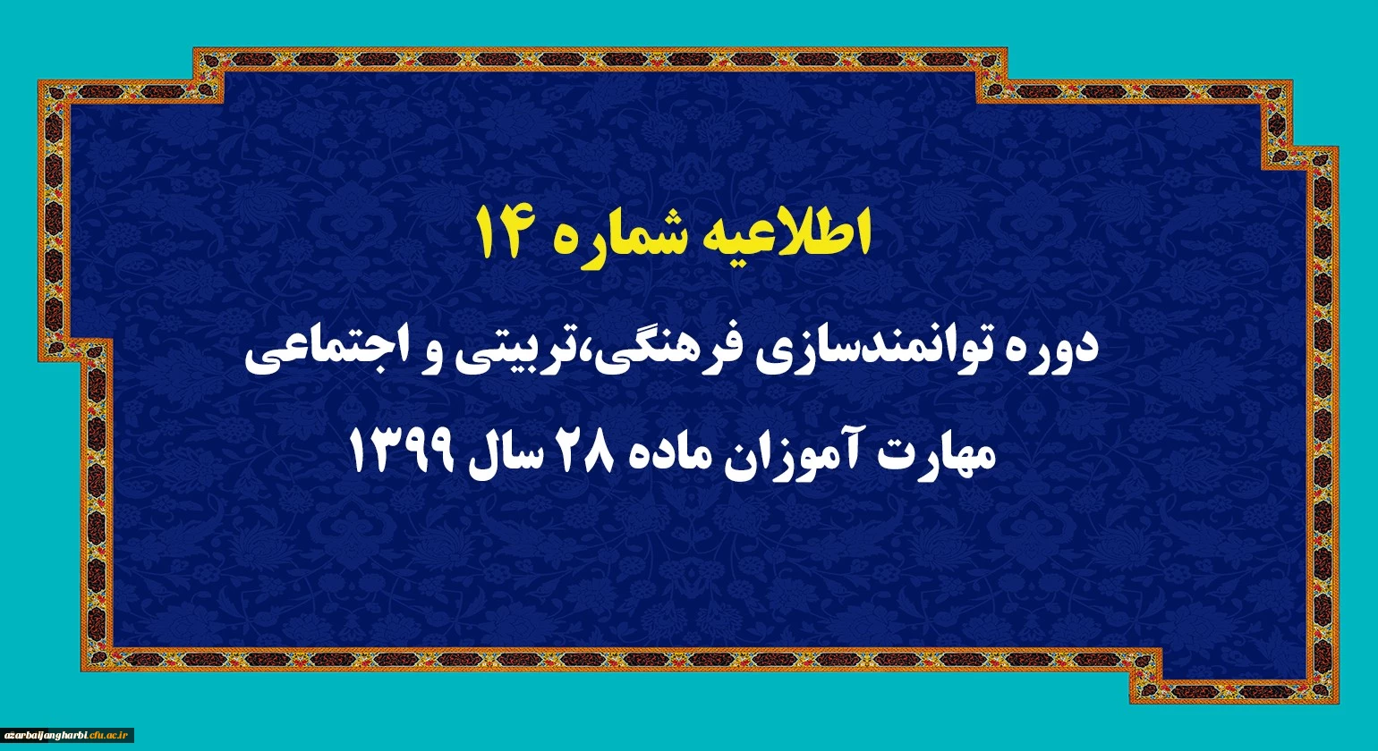اطلاعیه شماره 14 دوره توانمندسازی فرهنگی،تربیتی و اجتماعی مهارت آموزان ماده 28 سال 1399