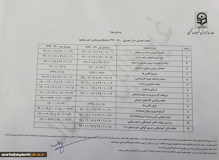 تقویم آموزشی کلیه مقاطع دانشگاه فرهنگیان 2