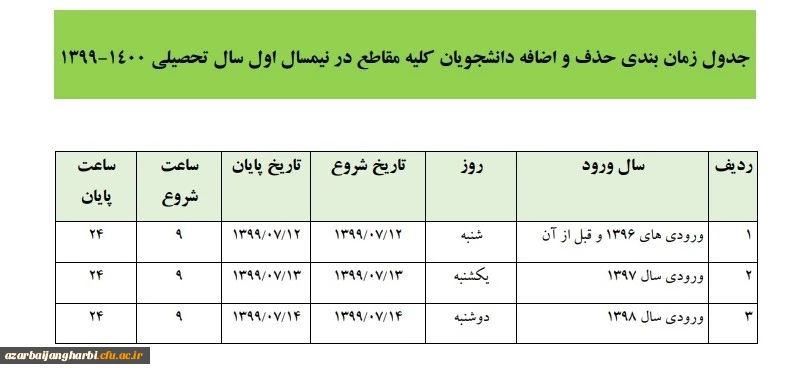 جدول زمان بندی حذف و اضافه دانشجویان کلیه مقاطع در نیمسال اول سال تحصیلی 1400-1399 2