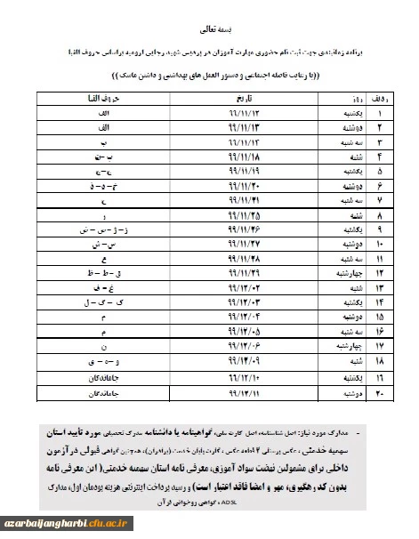 برنامه زمانبندی جهت ثبت نام حضوری مهارت آموزان 1399 در پردیس شهید رجایی آذربایجان غربی 3