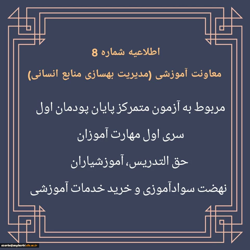 اطلاعیه شماره 8 معاونت آموزشی (مدیریت بهسازی منابع انسانی) مربوط به آزمون متمرکز پایان پودمان اول سری اول مهارت آموزان