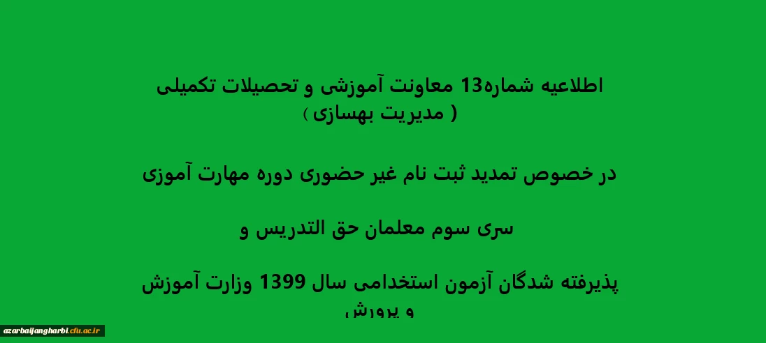 اطلاعیه شماره13 معاونت آموزشی و تحصیلات تکمیلی ( مدیریت بهسازی ) در خصوص تمدید ثبت نام غیر حضوری دوره مهارت آموزی سری سوم معلمان حق التدریس وپذیرفته شدگان آزمون استخدامی سال 1399 وزارت آموزش و پرورش 2