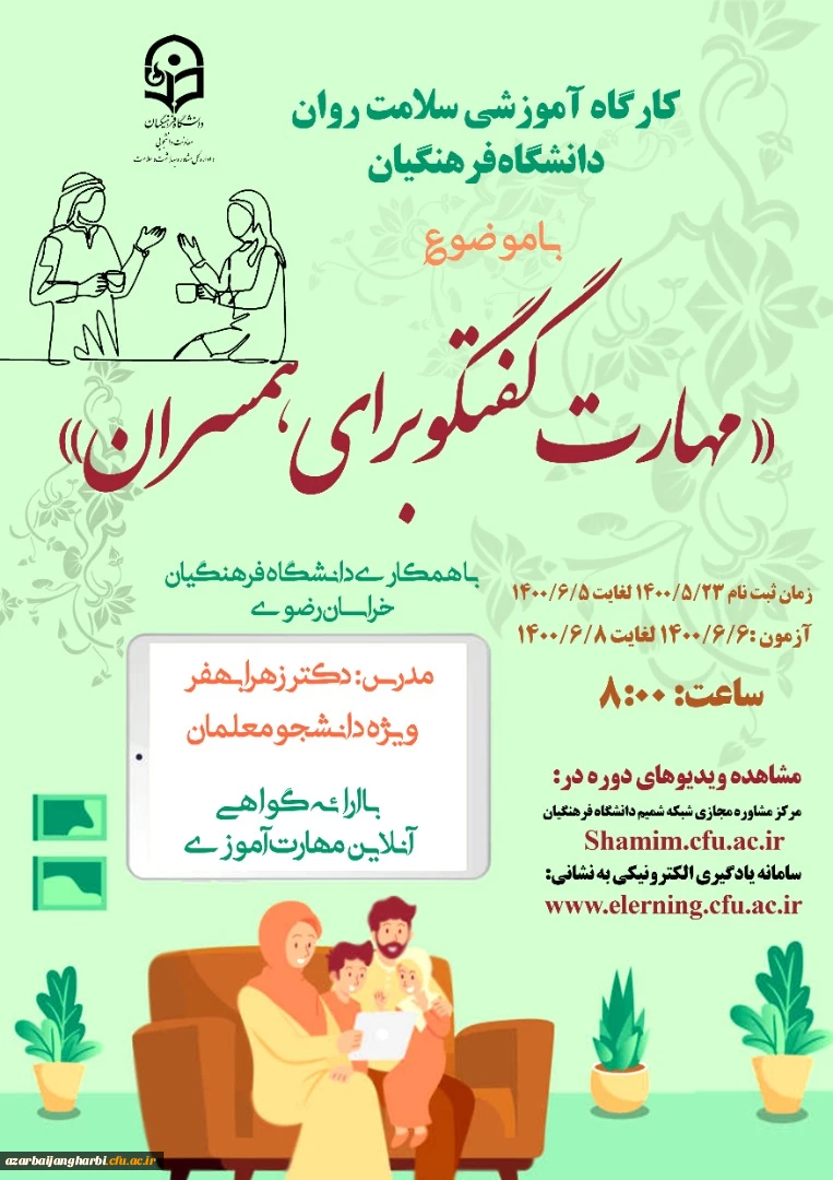امتیاز دهید : برگزاری کارگاه مجازی سلامت روان با عنوان مهارت گفتگو برای همسران 2 یکشنبه 31 مرداد 1400 ساعت 9:14