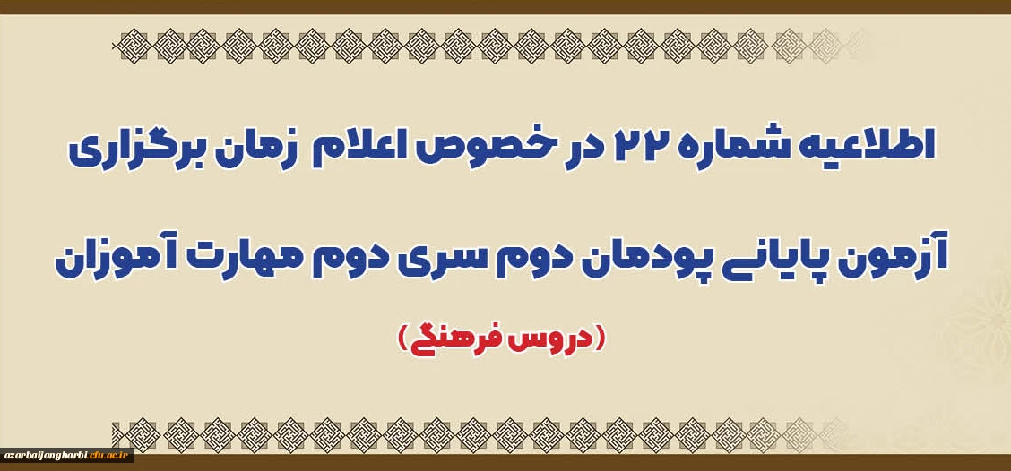 اطلاعیه شماره 22 در خصوص اعلام زمان برگزاری آزمون پایانی پودمان دوم سری دوم مهارت آموزان (دروس فرهنگی) 2