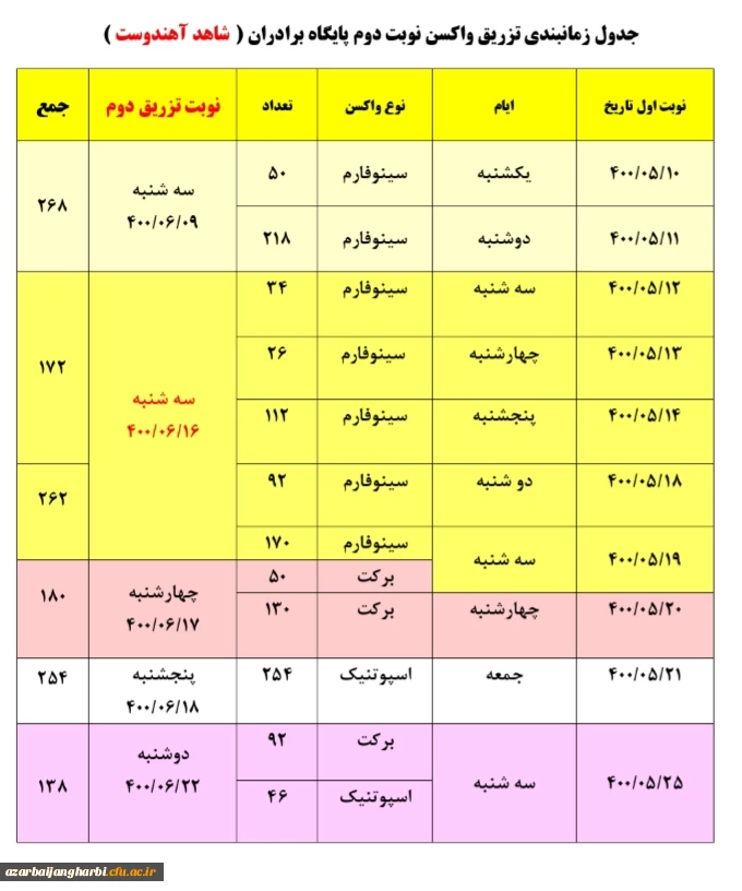 برنامه زمان بندی واکسیناسیون دانشجو معلمان ،اساتید و کارکنان دانشگاه فرهنگیان استان آذربایجان غربی 2