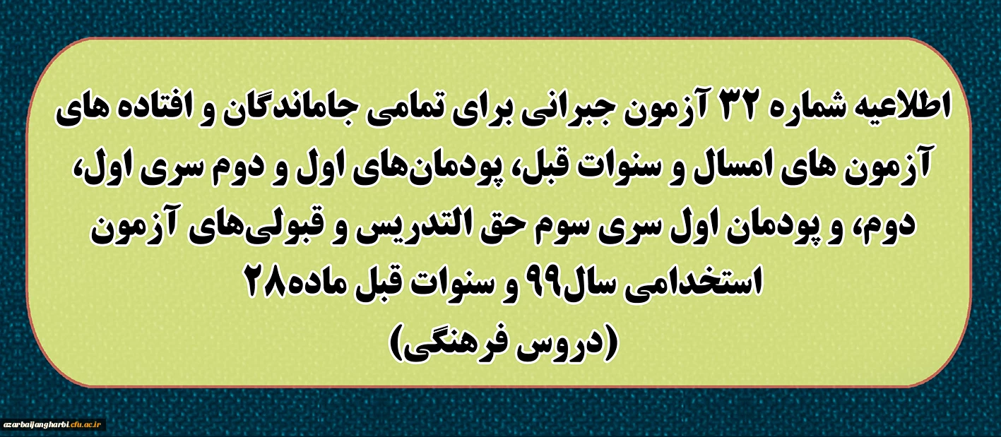 اطلاعیه شماره 32 آزمون جبرانی برای تمامی جاماندگان و افتاده های آزمون های امسال و سنوات قبل، پودمان های اول و دوم سری اول ، دوم، و پودمان اول سری سوم حق التدریس و قبولی های آزمون استخدامی سال 99 و سنوات قبل ماده 28 (دروس فرهنگی) 2